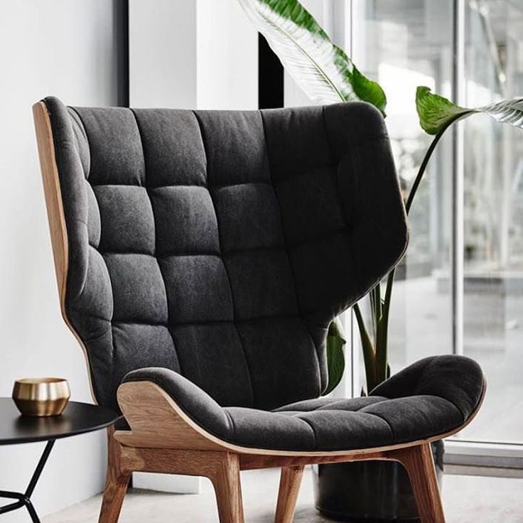 Sehr moderner Ohrensessel aus Eichenholz mit einer dicken Fluffi-Polsterung in Stoff oder Leder. Brandaktuelles, stilreines, minimalistisches skandinavisches Design. Ikonisch und komfortabel zugleich.