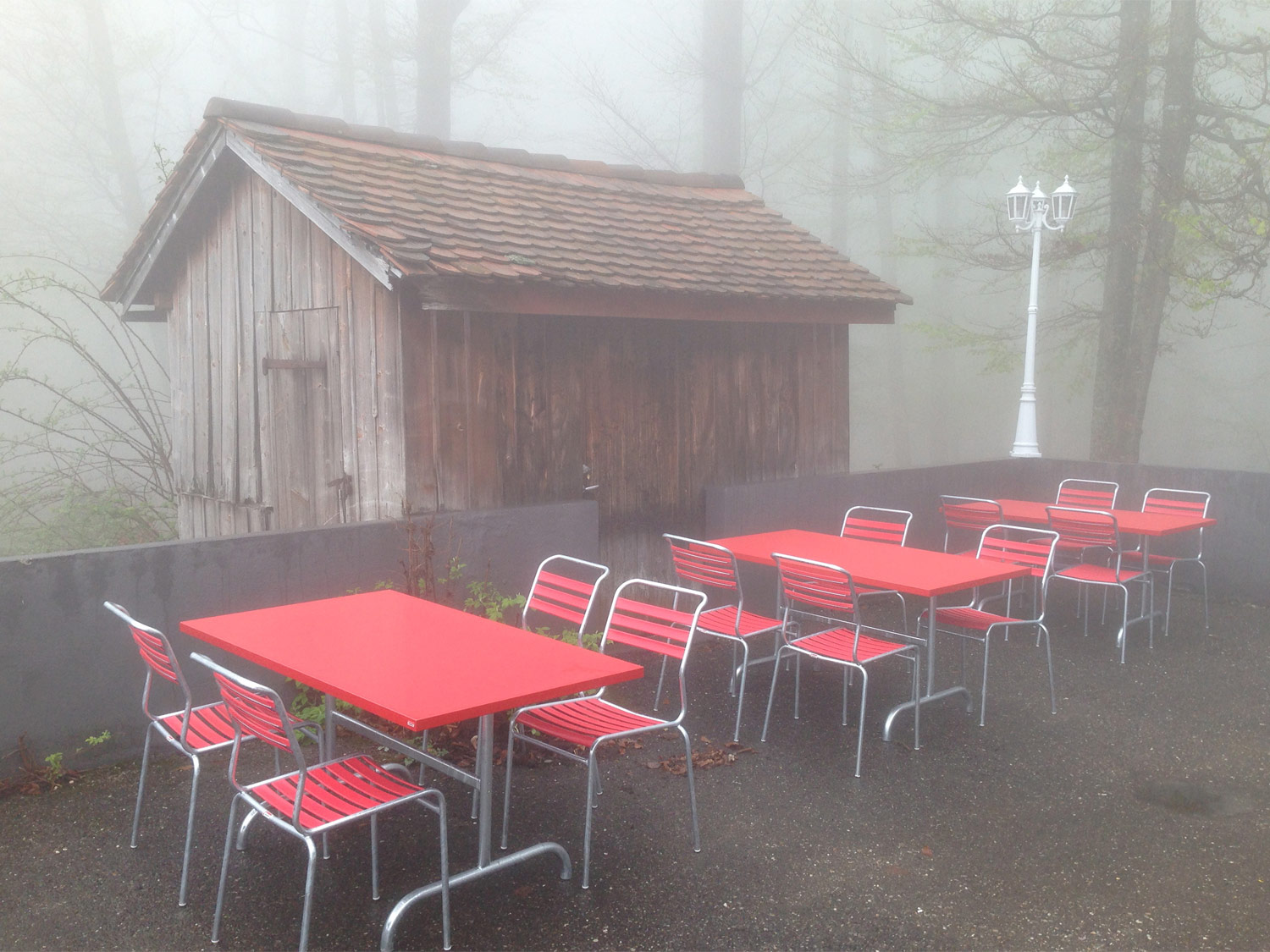 Stühle und Tische: Modell «Säntis» von Schaffner. Sonnenschirme: Glatz.